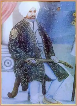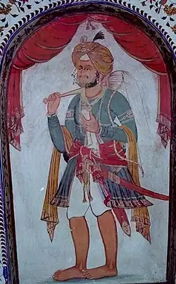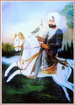 ![]() Fresco of a Mina Sikh figure from Pothimala, Guru Harsahai, ca.1745 | |