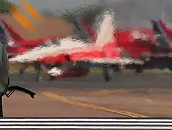 Heat haze, also called heat shimmer, refers to the inferior mirage observed when viewing objects through a mass of heated air. Common instances when heat haze occurs include images of objects viewed across asphalt concrete (also known as tarmac), roads, and over masonry rooftops on hot days, above and behind fire (as in burning candles, patio heaters, and campfires), and through exhaust gases from jet engines. When appearing on roads due to the hot asphalt, it is often referred to as a "highway mirage". It also occurs in deserts; in that case, it is referred to as a "desert mirage". Both tarmac and sand can become very hot when exposed to the sun, easily being more than 10 °C (18 °F) higher than the air a meter (3.3 feet) above, enough to make conditions suitable to cause the mirage.