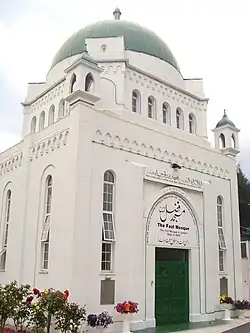 Upon arrival in London he proceeded directly to Ludgate to fulfill a prophetic Hadith which refers to the Bāb al-Lud (the gate of Lud)[52] and led some 300 Muslims in a lengthy prayer outside the entrance of St Paul's Cathedral.[53][54] His speech on Ahmadiyyat, the True Islam was read out in Wembley's Conference of Living Religions 1924, where he had been invited by the conveners of the conference to represent Islam. In London he also laid the foundation stone of the Fazl Mosque, an occasion which was well publicised. The construction of the Mosque was completed in 1926 and the cost thereof was borne entirely by the women of the community.[55] Later he also visited Pevensey in order to carry out a ritual imitation of William the Conqueror believing his visit to carry a mystical significance in fulfillment of its spiritual one in lieu of a vision he had seen before his departure, in India.[56] Whilst in Brighton he also paid a visit to the Memorial to Britain's Fallen Comrades-in-Arms from India during World War I known as Chattri (Brighton) and led prayers in the ground in front of the Brighton Pavilion.