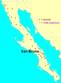 Mission San Bruno (Spanish: Misión San Bruno) was a short-lived Spanish mission established by Jesuit order on October 7, 1684, in what is now the Loreto Municipality of Baja California Sur, Mexico. The mission was the first Spanish mission established on the Baja California Peninsula.