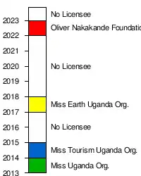 Uganda occasionally takes part in Miss Grand International; it debuted in 2013 and was represented by an appointed representative, Pierra Akwero;[5] however, she was unplaced on the international stage held in Thailand.[7] The license was transferred to different licensees each year, and all representatives were directly hand-picked; no Miss Grand National was held to determine the titleholders.[1][2][3][11] Statistically, all Ugandan candidates competing at the Miss Grand International received non-placements.[7][8][9][10]