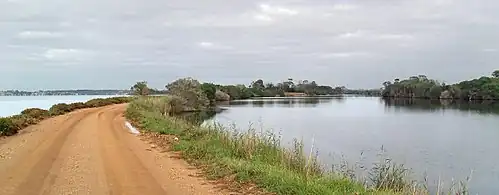 The Mitchell River silt jetties[1] are an unusually long, thin landform in the Gippsland Lakes region in Victoria, Australia. A type of digitate delta, they have been formed over thousands of years by sediment deposition from the Mitchell River during periods of low water flow and subsequent wash-through during periods of high water flow. The long narrow banks of silt thus formed extend more than eight kilometres east into Lake King. The south bank is navigable by car from Eagle Point through to the very easternmost tip at Point Dawson.
