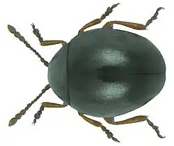 Mniophila muscorum is a species of Chrysomelid in the sub-family Galerucinae, that can be found nearly everywhere in Southern Northern Europe, Central Europe and East Europe and also in Italy it is not recorded in Turkey or the Caucasus and it is doubtfully recorded in Spain[1]
