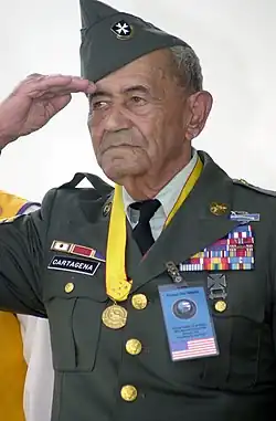 He earned the nickname "One Man Army".[8] On April 19, 1951, Cartagena, "with no regard for his own safety," as the official record states, left his position and charged directly into devastating enemy fire, single-handedly destroying two enemy emplacements on Hill 206 near "Yonch'on," North Korea. After taking out the emplacements, he was knocked to the ground twice by exploding enemy grenades. Nevertheless, he got up and attacked three more times, each time destroying an enemy emplacement until he was wounded. On October 19, 2002, during a ceremony honoring the 65th Infantry, when he was asked about the battle, Cartagena responded that he just hurled back at the Chinese the grenades thrown at him. He thought that the rest of the squad was behind him, and didn't realize most of them had been wounded and forced to take cover. Later they found 33 dead Chinese in the machine gun and automatic emplacements and they found 15 more dead in the positions he had destroyed on his way up the hill.[7] Cartagena, who had lost a lot of blood, was sent to Taibu in a helicopter and then to Japan to the 128th Station Hospital[9] where he was hospitalized for 62 days. According to 1st Lt. Reinaldo Deliz Santiago: