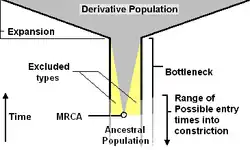 In 1987, PCR-amplification of mtDNA was first used to determine sequences.[16] In 1991 Vigilante et al. published the seminal work on mtDNA phylogeny implicating sub-saharan Africa as the place of humans most recent common ancestors for all mtDNAs.[17] The war between out-of-Africa and multiregionalism, already simmering with the critiques of Allan Templeton, soon escalated with the paleoanthropologist, like Milford Wolpoff, getting involved.[18][19][20] In 1995, F. Ayala published his critical Science article "The Myth about Eve", which relied on HLA-DR sequence.[21] At the time, however Ayala was not aware of rapid evolution of HLA loci via recombinatory process. In 1996, Parham and Ohta published their finds on the rapid evolution of HLA by short-distance recombination ('gene conversion' or 'abortive recombination'), weakening Ayala's claim (Parham had actually written a review a year earlier, but this had gone unnoticed).[22][23] A stream of papers would follow from both sides, many with highly flawed methods and sampling. One of the more interesting was Harris and Hey, 1998 which showed that the TMCRA (time to most recent common ancestor) for the PDHA1 gene was well in excess of 1 million years. Given a ploidy at this locus of 1.5 (3 fold higher than mtDNA) the TMRCA was more than double the expectation. While this falls into the 'fixation curve' of 1.5 ploidy (averaging 2 female and 1 male) the suggested age of 1.8 my is close a significantly deviant p-value for the population size, possibly indicating that the human population shrank or split off of another population.[24] Oddly, the next X-linked loci they examined, Factor IX, showed a TMRCA of less than 300,000 years.[25]