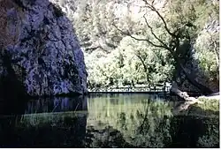 The monastery is located near the Piedra River Canyon, home to many species of birds, damselflies, trout, and endangered fish like the South-west European nase and an endangered species of barbel. The canyon itself includes a network of mossy, garden-like caves (natural and man-made), waterfalls and lagoons that contrast with the otherwise dry hills of southern Aragon. The tallest waterfall is "Horsetail" (Cola del Caballo), more than fifty meters high. The dissolution and precipitation of local limestone has created numerous rivulets, springs, and Karst topography. The Piedra River meanders around a mountain known as "El Espolón" (The Ram). In 1959, a dam was constructed across the river, which created the 1300 acre La Tranquera Reservoir, flooding part of the canyon, some of the best local farmland, and several villages. The roofs of some drowned houses can still be seen when the water levels are down. The reservoir provides domestic water supply, irrigation and electrical energy. The region is a popular tourist destination for hiking, camping, and water sports.