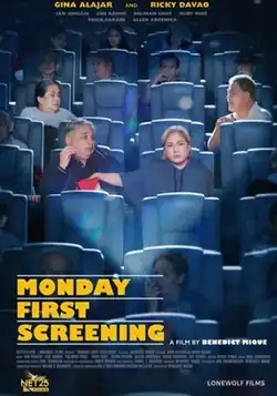 Monday First Screening is a 2023 Philippine romantic comedy directed by Benedict Mique and written by Mique and Aya Anunciacion. It Stars Ricky Davao, Gina Alajar. the film is about two elderly individual who find love while watching a free movie every Monday in a cinema.[1][2]