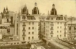 Vintage entrance to subte Line A of the Buenos Aires Metro on Avenida de Mayo; behind it, City Hall -