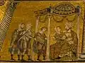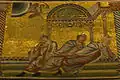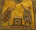 The last part of the interior to have mosaics added were the women's galleries between approximately 1300 and 1330.[1] These show angels and saints and their style agrees with Giovanni Villani's written evidence, which dates their completion to 1330 and probably dates the start of work to around 1300–1315. There are no art historical studies specifically on the mosaics of the women's galleries, though Venturi briefly notes that they were produced after 1300. The vault has a central motif of a starry sky, symbolic of the Empyrean, surrounded by angels with unclear attributes, possibly another set of angelic hierarchies.