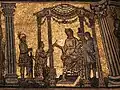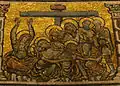 The three segments above the altar show the Last Judgement, with the centre almost completely filled by a figure of Christ the Judge seated on the Circles of Paradise and holding out his hands, showing his wounds from the Crucifixion, one facing palm up and the other palm down, directing souls to heaven and hell respectively. The large feet also show the wounds from the Crucifixion – their staggered pose, the robe's complex pleats and the side view of the legs avoid a rigid frontal effect, highlighted with golden tesserae. The cruciform halo includes mirror-like enamel cubes, also included in the border of the mandorla around Christ. Either side of the mandorla are three parallel registers, with two almost symmetrical hosts of angels at the top bearing symbols of Christ's passion and attributes of the Judgement, along with two angels sounding the last trumpet of the Apocalypse summoning the dead from their graves at Christ's feet.