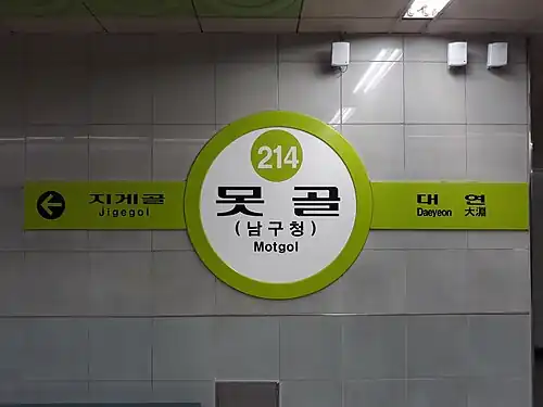 Motgol Station (Korean: 못골역) is a station on the Busan Metro Line 2 in Daeyeon-dong, Nam District, Busan, South Korea.