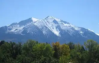 Mount Sopris is a twin-summit mountain in the northwestern Elk Mountains range of the Rocky Mountains of North America. The prominent 12,965-foot (3,952 m) mountain is located in the Maroon Bells-Snowmass Wilderness of White River National Forest, 6.6 miles (10.7 km) north by northeast (bearing 30°) of the community of Redstone in Pitkin County, Colorado, United States.[1][2][3][4]
