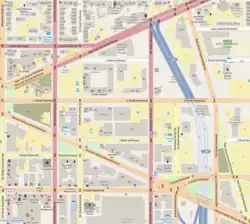 In 1946, a fire destroyed much of Center Market, resulting in many local businesses supported by the market to close or move to other parts of the city. The streetcar on New York Avenue was removed in 1949 and many of the residential buildings along that road were demolished and replaced with parking lots. In the 1960s, a large portion of the neighborhood's eastern section, including the remaining portion of Douglas Row, was demolished to make room for Interstate 395. During the 1968 riots that followed the assassination of Martin Luther King Jr., several buildings on the west side of Mount Vernon Triangle were burned.[3] By the 1980s, much of the neighborhood was decrepit, consisted of large parking lots and had become a haven for prostitutes and drug dealers.[4][5][6]