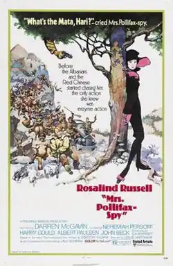 Mrs. Pollifax–Spy is a 1971 American comedy film directed by Leslie H. Martinson, starring Rosalind Russell, Darren McGavin, and Nehemiah Persoff. It was released by United Artists. Russell wrote the screenplay for the film, which she adapted from the novel The Unexpected Mrs. Pollifax by Dorothy Gilman. Russell used the pen name "C. A. McKnight," which was taken from her mother's maiden name.[2][3] It was Russell's last role in a theatrically released film.[4][1]