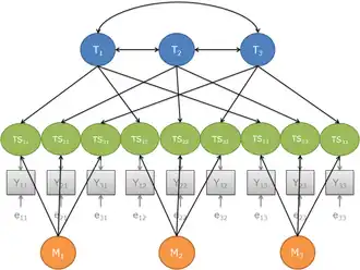 2) TSij = vij Fi + mij Mj where: vij is the validity coefficient, which is equal to: vij = σFi / σTSij Fi is the standardized latent factor for the ith variable of interest (or trait) mij is the method effect, which is equal to: mij = σMj / σTSij Mj is the standardized latent factor for the reaction to the jthmethod Consequently: vij2 = 1 - mij2 where: vij2 is the validity
