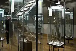 Pieces at display include: a gigantic microtome, the first heart-lung machine (prototype) by inventor Jacob Jongbloed (1948), the first kidney dialysis machine by inventor Willem Johan Kolff, X-ray equipment, an iron lung, galvanometer tools, a bow and arrow used to draw ultra thin quartz fibres (by shooting away a droplet of molten quartz), the original golden Nobel Prize medal from Willem Einthoven (for developing the first practical electrocardiogram in 1903)