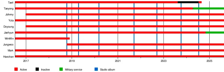 All ten members of NCT 127 were originally introduced through SM Rookies, a pre-debut training team established by SM Entertainment.[16] Johnny was the first member to join the label through an American audition at Chicago, Illinois, in 2007, while Yuta was recruited through the SM Global Audition in Osaka, Japan and Mark in Vancouver, Canada in 2012.[17][18] The same year, Taeyong and Jaehyun joined the label after being cast by label employees and passing auditions and were the first members to be introduced through SM Rookies.[19][20][21] Taeil was the next member to join the label in 2013, despite having chosen twice before to not pursue an idol career.[22] Doyoung and Donghyuck joined the label in 2013, with Winwin being introduced through SM Rookies on January 5, 2016, and Jungwoo on April 17, 2017.[23][24]
