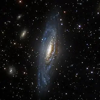 NGC 7331 Group is a visual grouping of galaxies in the constellation Pegasus. Spiral galaxy NGC 7331 is a foreground galaxy in the same field as the collection, which is also called the Deer Lick Group.[1] It contains four other members, affectionately referred to as the "fleas": the lenticular or unbarred spirals NGC 7335 and NGC 7336, the barred spiral galaxy NGC 7337 and the elliptical galaxy NGC 7340. These galaxies lie at distances of approximately 332, 365, 348 and 294 million light years, respectively.[2] Although adjacent on the sky, this collection is not a galaxy group, as NGC 7331 itself is not gravitationally associated with the far more distant "fleas"; indeed, even they are separated by far more than the normal distances (~2 Mly) of a galaxy group.
