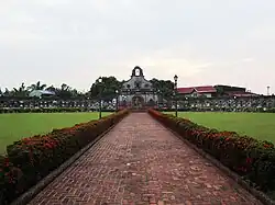The Baroque cemetery is located two kilometers south of downtown Nagcarlan that takes the shape of a circular cemetery across a 1 hectare property.[1][2] It is surrounded by octagonal stone walls made of red tiles with iron-wrought grills.[6] A façade or arch of about 18 feet high with two iron grill gates leads to a red tiled pathway across a green space leading to the cemetery chapel. The chapel containing a statue of Santo Sepulcro serves as a place for requiem or funeral mass. Located 15 feet below the chapel is an underground graveyard consisting of only 36 tombs arranged in four walls [7] The crypt and chapel is connected by two flight of steps. The first nine steps lead to a Spanish inscription that reads:[2]