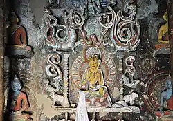 Nako monastery (Tibetan language:Lob-dpon-zhabrjes [12]) dated to the 11th century (1025 AD[2]), oriented towards Tibet, similar in style to the Tabo Monastery[13] consists of four large halls of which the oldest and largest is known as Dukhong. It is also known as 'Lotsava Jhakang' meaning "complex of the translator"[3] named so in honour of Rinchen Zangpo who translated Buddhist scriptures from Sanskrit to the Tibetan language.[13] The iconographic art work in the monastery is related to Vajrayana Buddhism.[14] The dukhong's walls have decorations of a complete mandala with "gates, fire-circle and secondary non-Buddhist deities in attendance". To the east of this dukhong there is another hall of smaller size which has a sculpture of Yellow Tara (known as Grolgster[2]) made in stucco, with its roof and walls painted with mandalas. In the third hall there is an elegant image of Vairochana. Within the complex there is a shrine dedicated to Purgyal, a local deity with attribution as the "spirit of the mountain". Sculptures of five Dhyani Buddhas made out of clay are defied in the main hall where there are also many images.[3]