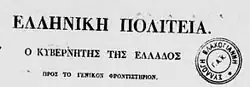 {{cite book}}: CS1 maint: location missing publisher (link) - ^ Government Gazette Issues start bearing the name "Hellenic State" on March 15 prior to the formal abolition of the monarchy: the new header of the Gazzete (ΦΕΚ Α΄ 56/1924) is concomitant with the publication of two Royal Decrees signed by Regent Kountouriotis.