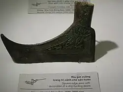 The term "Việt" (Yue) (Chinese: 越; pinyin: Yuè; Cantonese Yale: Yuht; Wade–Giles: Yüeh4; Vietnamese: Việt) in Early Middle Chinese was first written using the logograph "戉" for an axe (a homophone), in oracle bone and bronze inscriptions of the late Shang dynasty (c. 1200 BC), and later as "越".[6] At that time it referred to a people or chieftain to the northwest of the Shang.[7][8] In the early 8th century BC, a tribe on the middle Yangtze were called the Yangyue, a term later used for peoples further south.[7] Between the 7th and 4th centuries BC Yue/Việt referred to the State of Yue in the lower Yangtze basin and its people.[6][7]