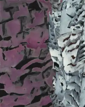 In later series Manter has explored urban environments and geological phenomena in works that juggle spaces structured by planes of color and texture (e.g., Cross-cut #1, 2025).[6][32][33] Her "Run and Slide" and "Run and Pour" series (2021) employ pockets of color that suggest toxic chemical activity, such as the yellow and green smog and waterways of Superfund sites.[32][18] In other works, she references geological terms like "dip-slip faults" and "chatter marks" in form and titles.[6] Maine Arts Journal editor Véronique Plesch noted, "Her abstract work displays tectonic shifts as fluid streaks of color spread across the pictorial field, with caesuras rupturing it like fault lines, the color scheme and abrupt contrasts in value suggesting intense weather patterns interacting with the environment—sea, rocks, vegetation."[19]