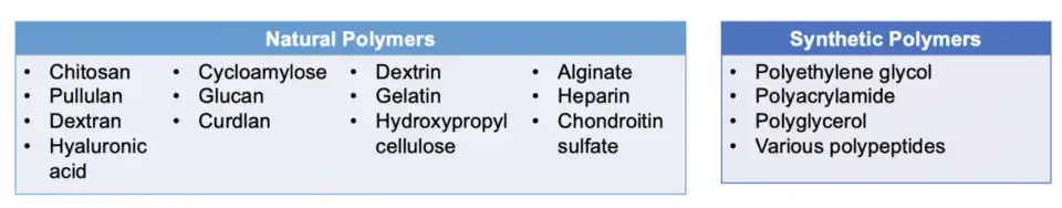 Since biodegradability is an important characteristic of nanogels, these hydrogels are typically composed of natural or degradable synthetic polymers.[3] Polysaccharides and proteins largely dominate the natural forms of polymers used to synthesize nanogels.[2][3] Due to the use of thiolated polysaccharides (thiomers) such as thiolated chitosan or thiolated hyaluronic acid[8][9] nanogels can be stabilized via intra- and interchain disulfide bonding. Advantages of natural polymer-based nanogels include biocompatibility and degradability by cellular mechanisms in vivo.[3] Natural polymers also tend to be nontoxic and bioactive in which they are more likely to induce biological cues that govern various aspects of cellular behavior.[3] However, natural-based polymers can still cause an immune response and possess other disadvantages such as variable degradation rates and heterogeneous structures.[3] Conversely, synthetic-based polymers have more defined structures, increased stability, and controlled degradation rates.[3] In comparison to natural-based polymers, synthetic polymers lack biological cues that may be necessary for specific therapeutic applications.[3] Given that natural and synthetic polymers are defined by their own set of advantages and disadvantages, an ongoing area of research aims to create composite hydrogels for nanogel synthesis that combines synthetic and natural polymers to leverage the benefits of both in one nanogel formulation.[3]