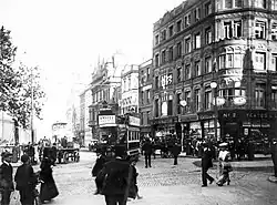 From the 1960s onwards many of the Georgian and Victorian buildings on the street were demolished in favour of modern retail and office units. One such development was on the corner of Nassau Street and Dawson Street by the Norwich Union Group. A collection of 15 Georgian and Victorian buildings were demolished, including the original Elverys Sports corner store[6] and the 1870 McCurdy's Law Club.[7] The new 5-storey t-shaped office block with street-level retail units was designed by Lardner and Partners.[6] The new building, completed in 1967 was called Nassau House. Permission was granted to demolish this block in 2016,[8] and the construction of a replacement mixed-use development is due for completion in 2022.[9] In the 1970s, a 2.5 acre site facing onto the street was redeveloped as the Setanta Centre.[10]
