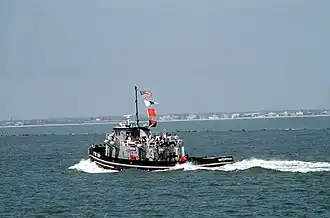 ![]() Natchitoches (YTB-799) heads across Charleston harbor with reporters and cameramen aboard. | |