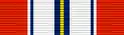 The cross is suspended from a ribbon 1.375 inches (34.9 mm) wide. It consists of wide edge stripes of scarlet, a stripe of white separated by a thin stripe of old glory blue, with central stripe of golden yellow bordered on each side by stripes of old glory blue.[3]