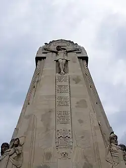 A dramatic limestone Art Deco tower called the Charity Crucifixion Tower, completed in 1931, features integrated figural sculptures by Rene Paul Chambellan, including a large figure of Christ on the cross, 28 ft (8.5 m) high on the Woodward Avenue façade. The sculpture, using Chambellan's design, was completed by Italian stone carver, Enrico (Harry) Liva, chief carver of the Ingalls Stone Company of Bedford, Indiana.[11][12] It was built as a response to the Ku Klux Klan as a "cross they could not burn".[13] The sides and rear feature windows inside the crucifix which can be lit from within. At the upper corners of the tower are symbols of the Four Evangelists. Carved below the feet of the figure of Christ are the Seven Last Words from the Cross. Just below them is a doorway with "Charity" and "Christ Crucified" carved above it. On the sides of the doorframe are depictions of items associated with the Passion. The doorway leads to a small balcony which can serve as a pulpit. On the front are carved depictions the Archangels Jophiel, Raphael, Michael, Gabriel and Uriel. The pulpit is flanked by depictions of John the Apostle and the Virgin Mary to the left and a Roman Centurion holding a spear and Mary Magdalene on the right.[14] Across the terrace facing the crucifix a depiction of Saint Thérèse of Lisieux is carved into the surrounding wall. This sculpture is also by Chambellan.