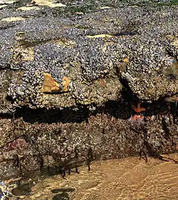Dramatic wave-cut platforms, exposed rocky cliffs, salt marsh, and sandy and rocky shores provide habitat for a wide range of species that inhabit Natural Bridges. These habitats include sandy beach, rocky intertidal, and surfgrass.[4]