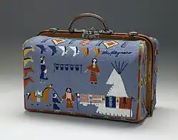 Pictorial Valise (c. 1903), is part of the Hirschfield Family Collection[10] and was displayed as part of the Artists of the Earth and Sky exhibit at the Metropolitan Museum of Art.[11] It was created as a gift for her daughter Josephine at the time of her graduation from the Carlisle Indian School in Pennsylvania, and depicts Chief Two Bears' actions in the Battle of Whitestone Hill in 1863.[12]