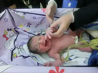 A 30-minute old infant in Iran. The nurse is providing necessary care after birth.