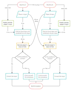 An alternative system to the previous netcode is rollback netcode. This system immediately runs the inputs of the local player (so that they are not delayed as with delay-based netcode), as if it were an offline game, and predicts the inputs of the remote player or players instead of waiting for them (assuming they will make the same input as the one in the previous tick). Once these remote inputs arrive (suppose, e.g., 45 ms later), the game can act in two ways: if the prediction is correct, the game continues as-is, in a totally continuous way; if the prediction was incorrect, the game state is reverted and gameplay continues from the corrected state, seen as a "jump" to the other player or players (equivalent to 45 ms, following the example).[1] Some games utilize a hybrid solution in order to disguise these "jumps" (which can become problematic as latency between players grows, as there is less and less time to react to other players' actions) with a fixed input delay and then rollback being used. Rollback is quite effective at concealing lag spikes or other issues related to inconsistencies in the users' connections, as predictions are often correct and players do not even notice. Nevertheless, this system can be troublesome whenever a client's game slows down (usually due to overheating), since rift problems can be caused leading to an exchange of tickets between machines at unequal rates. This generates visual glitches that interrupt the gameplay of those players that receive inputs at a slower pace, while the player whose game is slowed down will have an advantage over the rest by receiving inputs from others at a normal rate (this is known as one-sided rollback).[6] To address this uneven input flow (and consequently, an uneven frame flow as well), there are standard solutions such as waiting for the late entries to arrive to all machines (similar to the delay-based netcode model) or more ingenious solutions as the one currently used in Skullgirls, which consists of the systematic omission of one frame every seven so that when the game encounters the problem in question it can recover the skipped frames in order to gradually synchronize the instances of the games on the various machines.[7]
