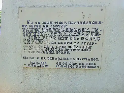Georgieva was killed on 16 December, 1942 in Nežilovo, Čaška, during the World War II in Yugoslav Macedonia by a local anti-guerrilla detachment,[3][4] while covering the escape of her adult comrades in the guerrilla squad.[5] Her head was cut off and paraded through the villages and the city of Veles by the local anti-guerrilla chetniks to cause fear amongst the population.[6]