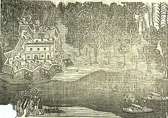 In 1791, due to the bad state of the fort's structure, which had been damaged by a fire[5] and Kadiwéu attacks,[7] works were started to renew it, this time using masonry.[8] This was also in part motivated by the Spanish building Forts Borbon and of San Carlos del Apa in the region. Then captain-general Caetano Montenegro ordered it to be built "in the edge of the hill, where two great lengths of the Paraguay River present themselves at an obtuse angle, which will be then flanked by the new fort, something the old base wouldn't do."[b][7]
