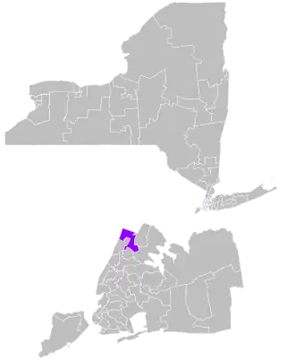The district overlaps with New York's 13th, 14th, and 15th congressional districts, and with the 77th, 78th, 79th, 80th, 81st, 86th, and 87th districts of the New York State Assembly.[5]