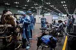 In March 2020, the U.S. Army dispatched soldiers from Army Corps of Engineers field hospitals in Fort Campbell, Kentucky, and Fort Hood, Texas, to New York City to convert New York City's Javits Convention Center into a 2,910-bed civilian medical hospital.[68] More medical hospitals will be set up by these Army officers in New York City as well.[68] On March 30, the U.S. Navy medical ship USNS Comfort arrived in New York City to assist with non-COVID operations, relieving land hospitals to stop the city's growing COVID-19 pandemic.[69] It was later announced that field hospitals would be set up in Central Park and at the Billie Jean King National Tennis Center in Queens.[70] On March 31, it was revealed that Andrew Cuomo's brother Chris, a New York City resident and CNN journalist, had been diagnosed with COVID-19, and that New York City saw its first COVID-19-related death of a child.[71][72]
