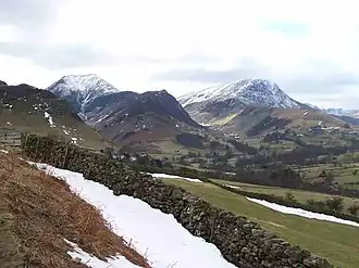 The scenery of the Newlands valley consists of farmland in the valley bottom and soaring fells above. Fells that have their foot in the valley include Barrow, Causey Pike, Catbells, Ard Crags, Knott Rigg, Maiden Moor, High Spy, Dale Head, Hindscarth and Robinson. The quality of the fell walking is very good; the Newlands horseshoe is a 14-kilometre walk, starting and finishing at Little Town, with over 1,000 metres of ascent, taking in most of the 2,000-foot peaks at the head of the valley.[7] On the steep slopes of Ard Crags above Keskadale farm is Keskadale Oakwood, which is an ancient oak and alder woodland, a Site of Special Scientific Interest and a Special Area of Conservation. It has an area of 50 hectares and has been fenced off for an initial period of 15 years to encourage natural regeneration and keep out grazing animals.[8]
