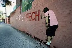 Since the 1980s, the area surrounding the Sydney inner west suburb of Newtown, Australia, including the suburbs of Newtown, Enmore, Erskineville, Camperdown, and St Peters, has been known for its wide range of prominent graffiti and street art on walls.[1] The public visual art in the Newtown area consists of a variety of styles and methods of execution, including large-scale painted murals, hand-painted (or sprayed) political slogans, hand-painted figurative designs, spray painted semi-abstract designs (including large-scale and elaborate semi-pictorial) "tags"), and other stylistic developments such as stencil art and street poster art (also known as "wheatpasting"), "Yarn bombing", and sculptural items cast from plaster and other materials.[2]