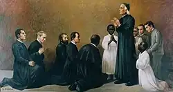 He was a student to the priest Antonio Cesari and was also a close disciple to Saint Gaspare Bertoni who both proved to be strong influences on Mazza's life and personal spiritual inclinations. Cesari was brought in to homeschool Mazza since the latter's often frail health prevented him from going to school. His vocation matured under Cesari's guidance and he soon felt called to enter the priesthood as a more direct means to dedicate himself to the needs of the poor.[1] He commenced his ecclesial studies in Verona on 21 June 1807 before Mazza received his ordination to the priesthood on 26 March 1814.[4] Following his ordination he first served in the churches of S. Fermo Maggiore and San Nicolò before being assigned in 1816 to teach seminarians in Verona. For over three decades from 1816 until 1849 he taught students in Verona both mathematics (from 1815 to 1816) and, occasionally, physics and world history.[3] The students held him in high regard as did fellow teachers while some of his students included the Venerable Antonio Provolo and Blessed Zefirino Agostini.[4][2] It was also around this time that he became a confessor and close friend to the Venerable Teresa Campostrini. His professorship solidified his desire to create a range of opportunities for people to have a fairer and better access to education irrespective of their class or economic status. His companions around this point following his ordination - students and confreres alike - knew of Mazza's desire to evangelize Africa and referred to him as "Don Congo".[2]