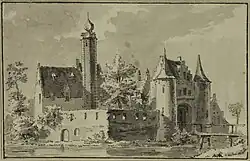The current building has little to do with the medieval castle. A high stair tower which used to be on the south side of the main building of the medieval castle is now part of the northern façade of a late eighteenth-century building. There are multiple pictures of the 17th and 18th-century situation, showing that it was indeed a true castle with a square layout with an inner court surrounded by a moat. The best picture of the medieval castle might be a fragment of a 1629 map (cf. below), showing what seems to be a large defendable tower. Such a structure would be in line with the repeated use of the castle in the Eighty Years' War but should be confirmed by research.