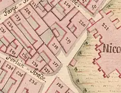 The number of residents had increased to 21 by 1845. The now-widowed Christiane Elisabeth Amundsen was still residing with her four children on the ground floor.[9] J. Petersen, a courier working for Rentekammeret, was also residing on the ground floor with his two children (aged 13 and 15) and a maid.[10] Christian Ferdinand Christensen (1805–1883), a scenic painter at the Royal Danish Theatre, resided on the second floor with his wife Ida née Thaning, their four children (aged two to eight), his mother-in-law Hedevig Thaning and two maids.[11] Thomas Nielsen, a grocer (høker) resided in the basement with his wife Karen Marie Nielsen née Petersen and a maid.[12]