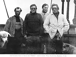 Shackleton had Captain England replaced by Frederick Pryce Evans, who had captained Koonya when she towed Nimrod south in January 1908. In January 1909 Evans brought Nimrod back to Antarctica to rendezvous with the returning expedition team, which Shackleton had split into parties, each with its own objective. The "Northern Party" had explored Victoria Land, and on 2 February 1909 reached its arranged rendezvous point to meet the ship, but heavy drifting snow prevented Nimrod's lookouts from seeing the Northern Party's camp.[19] She continued to the Ferrar Glacier, where she picked up a three-man party who had been doing geological work. She then returned, and two days later succeeded in finding and re-embarking the Northern Party.[20]