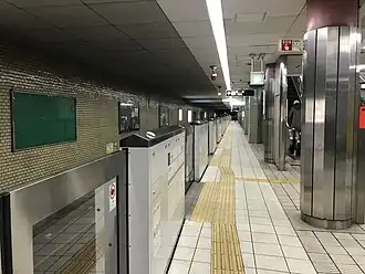 - The station has side platforms serving two tracks for the Sakaisuji Line on the first basement, and an island platform serving two tracks for the Sennichimae Line on the second basement. Ticket gates are located on the first basement on the platforms for the Sakaisuji Line.