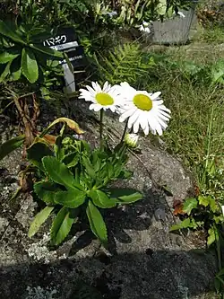 Nipponanthemum nipponicum, commonly called "Nippon daisy" or "Montauk daisy," is a plant species native to coastal regions of Japan but cultivated as an ornamental in other regions.[3][4] It is now naturalized as an escapee along seashores in New York and New Jersey.[5][6] It is the only species in the genus Nipponanthemum, formerly considered part of Chrysanthemum.[7][8]
