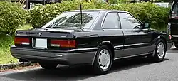 The first Leopard (also known as Leopard TR-X) was introduced in September 1980 as a contender in the upper medium class of cars. The Leopard was positioned as a larger coupe and sedan above the top level Nissan Bluebird 810 with the six-cylinder engine. The Leopard coupe was introduced after the Toyota Chaser but before the Toyota Soarer.[2][3] The angular body, available as a two-door hardtop coupé "personal luxury car", and a four-door hardtop sedan, which featured very slim C- and D-pillars and large glass surfaces. The coupé featured a "glass-to-glass" rear window sharing the very slim C- and D-pillars from the sedan. The angular appearance was shared with the Fairlady Z, and the coupé was exclusive to Nissan Store Japanese Nissan dealerships while the sedan was exclusive to Nissan Cherry Store. The coupé replaced the Nissan Cedric coupé and the Nissan Laurel coupé. The wind resistance drag coefficient of the two-door version is 0.37.[4] At the time of introduction, the two body styles both carried the same price tags.[1] The Leopard featured some industry firsts, for instance a fuel consumption gauge in the dashboard.