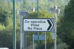 The village originally consisted of four terraced houses, known as No Place. In 1937, residents of the terrace of houses to the north, known as Co-operative Villas, demolished these houses, but took on the name for their own village.[2] Derwentside Council tried to change the name of the village to Co-operative Villas in 1983; however, they met with strong protests from local residents at the removal of all signs pointing to No Place.[4] Today the signs say both No Place and (at the request of some residents) Co-operative Villas.[1]